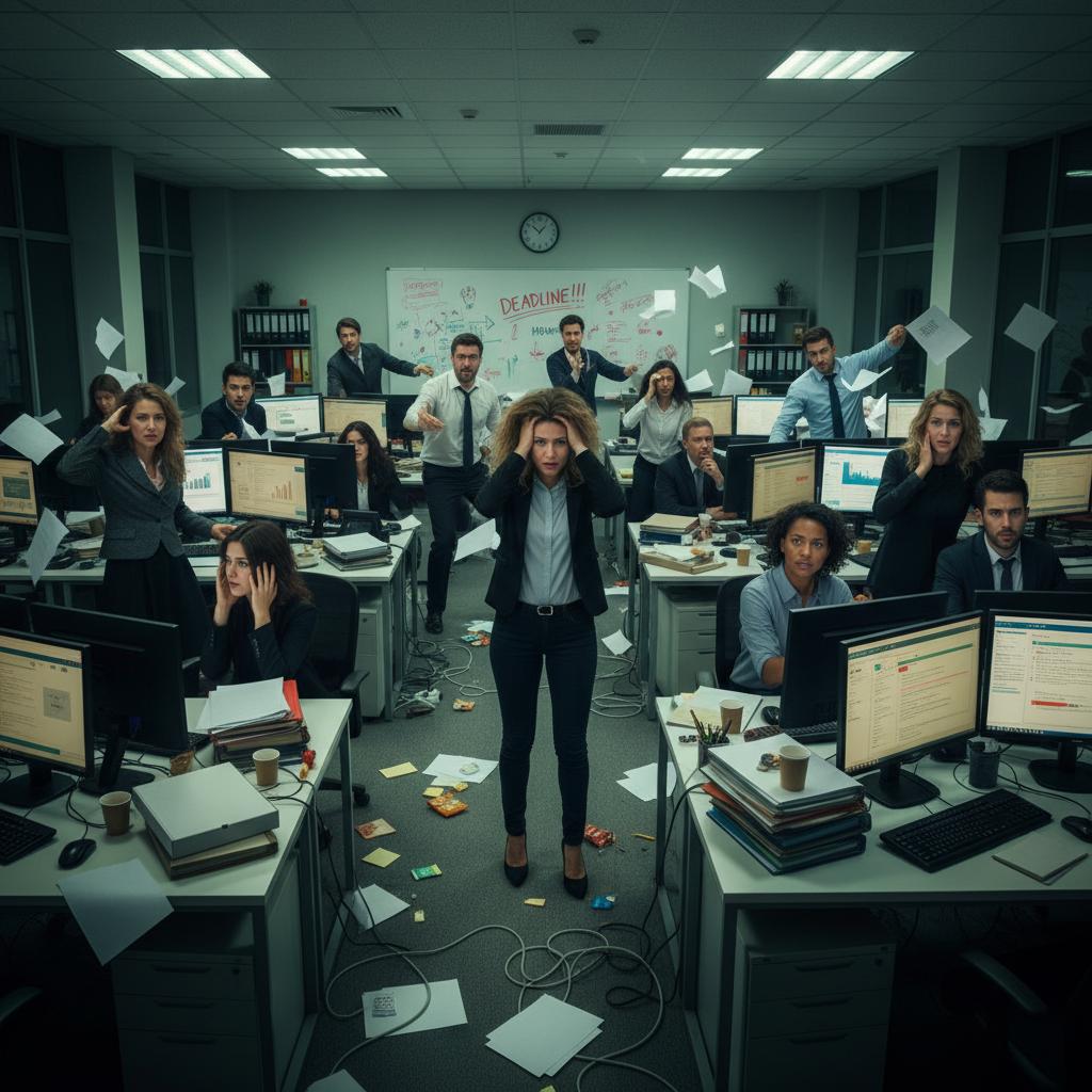 Zdjęcie: Pracownicy w chaosie organizacyjnym – ilustracja systemowego źródła stresu.